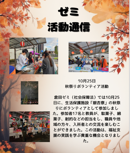 2025年10月25日、倉田ゼミ(社会保障法)は、生活保護の救護施設「銀杏寮」で行われた秋祭りにボランティアとして参加しました。