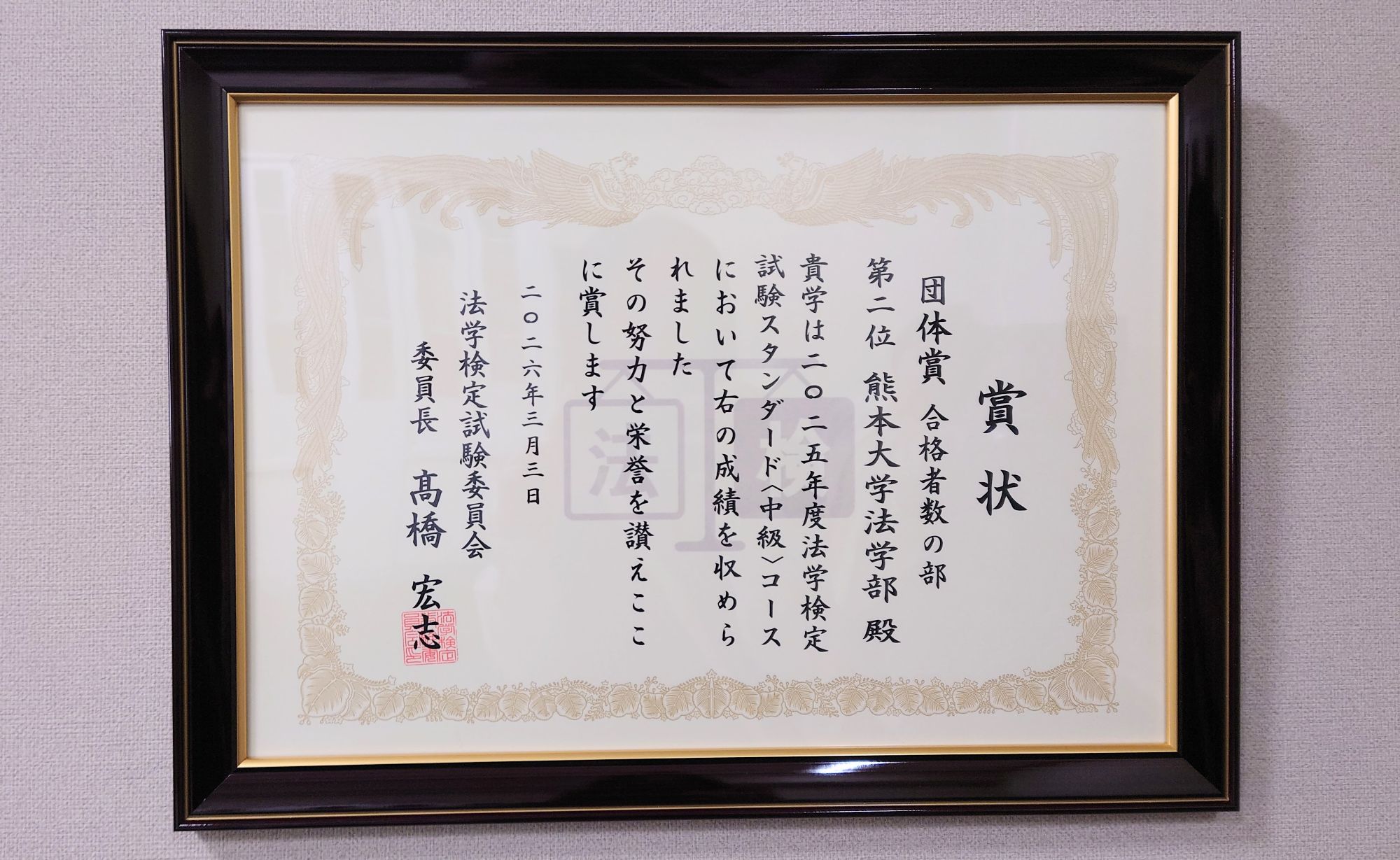2025年11月30日に実施された法学検定試験のスタンダード<中級>コースにおいて、熊本大学法学部生の合格者数が全国第2位となりました。