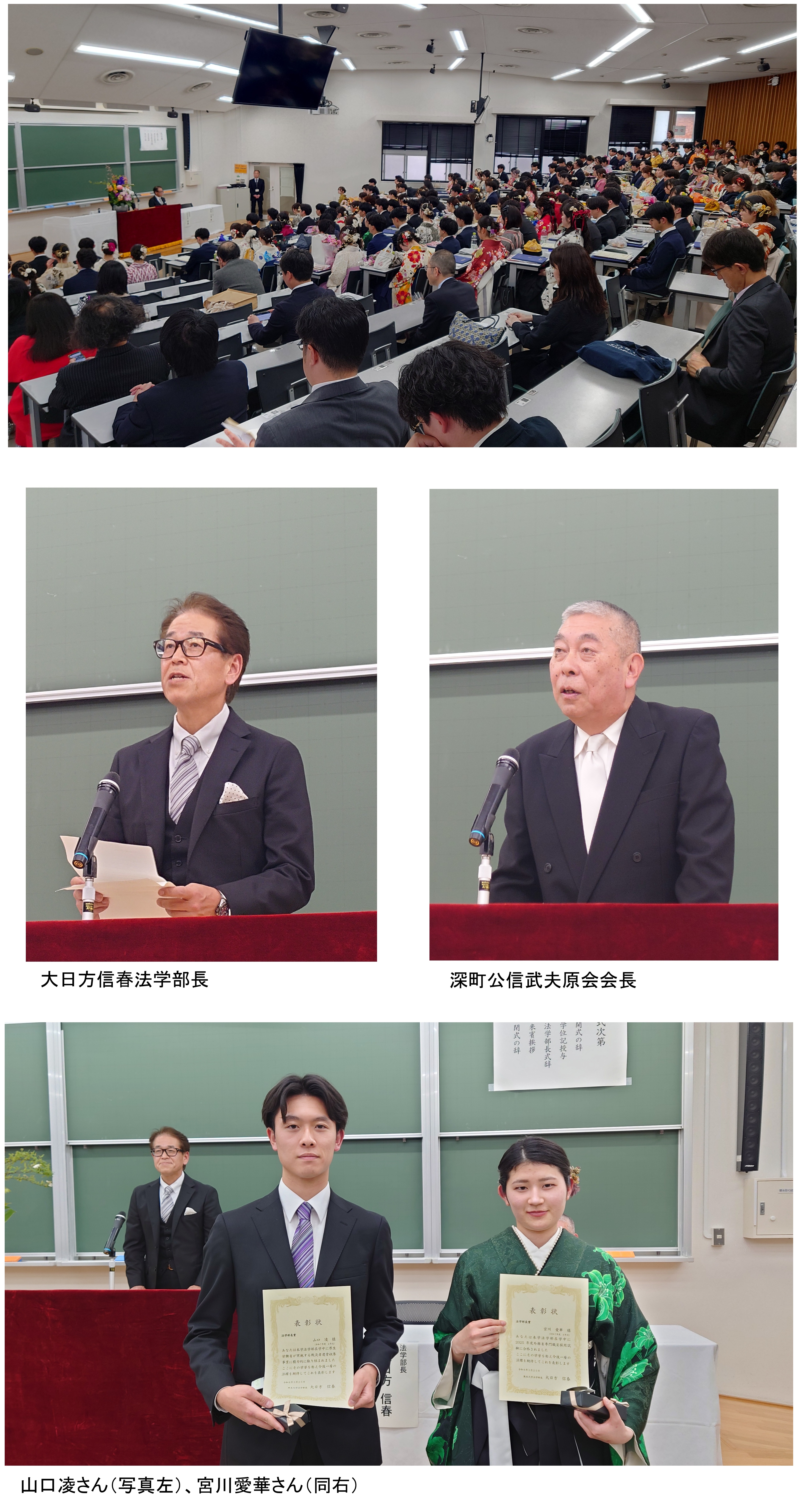特に、法学部長賞の表彰を受けた山口凌さんは、厚生労働省実施の戦没者遺骨収集事業を始め多くのボランティア活動に従事されたことを理由として、また同じく表彰された宮川愛華さんは本学法学部生として約25年振りに外務省専門職員試験に合格されたことを理由として、受賞されました。